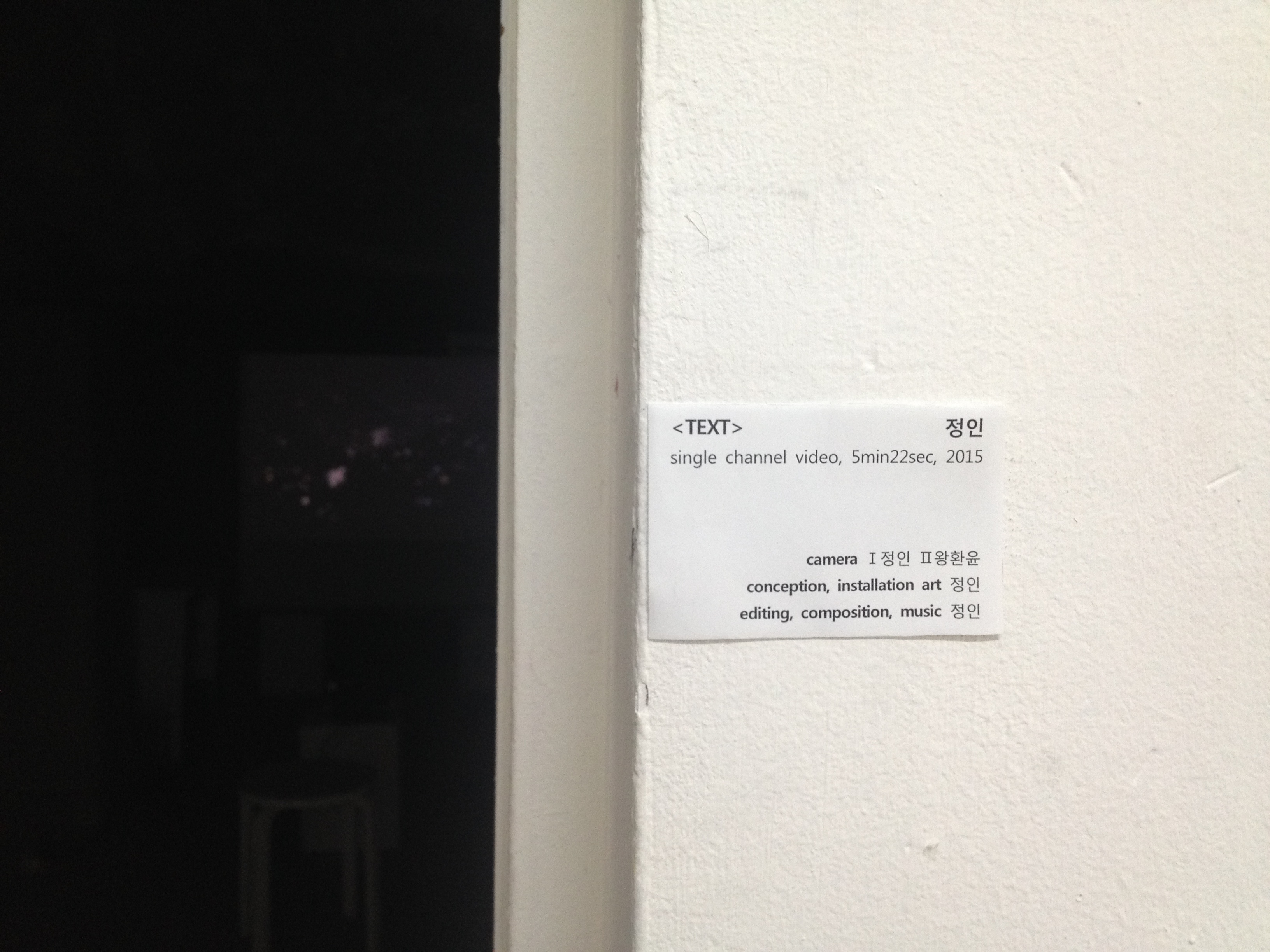 "NOW SHOWING" *일시: 2015.3.3(화)~3.20(금) *장소: 스페이스제로 갤러리 1층 창고 *참여작가: 정인(3학년/조소과), 왕환윤(4학년/한국화과) ; 문학의 속성과 인간의 상상력에 대한 본인의 관심과 생각을 바탕으로 만들어진 영상(Single channel video, 0;05:22)을 스페이스 제로 창고에서 반복재생으로 상영함.